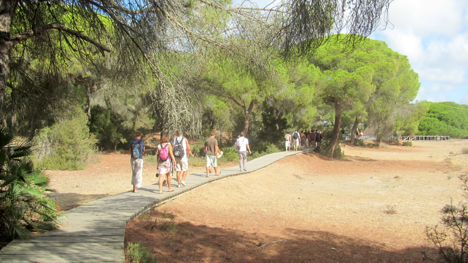 Durante el trayecto se hacen dos paradas, la primera en un pequeño poblado de chozas entre pinares llamado "la Plancha" donde se realiza un pequeño recorrido interpretativo del entorno visitando los "Llanos de Velázquez". La segunda parada es en las Salinas de la Algaida donde puede observarse la riqueza de la fauna avícola de Doñana en un ecosistema típico marismeño.